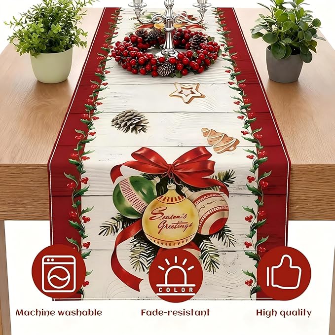- Premium Fabric: This Christmas table runner measures 72x13 inch and is crafted from fine-quality linen. Its durable material boasts exceptional properties, including heat resistance, effectively preventing damage from hot dishes during festive meals. It serves as an ideal decorative choice for both indoor and outdoor holiday arrangements, seamlessly complementing any Christmas-themed setting. Whether enhancing the dining table for cosy indoor gatherings or adorning the porch as outdoor Christmas décor, it elevates the festive atmosphere.