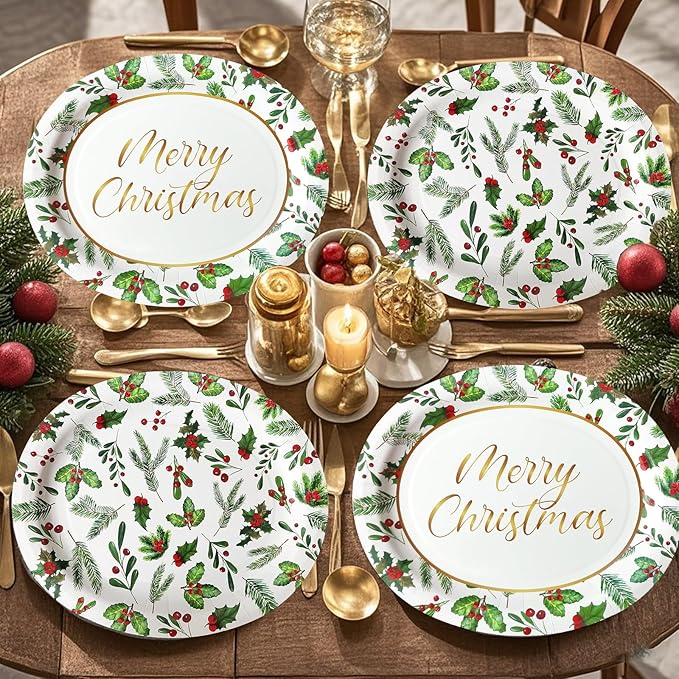 - 10" x 12" Large Oval Paper Plates and Napkins Set : Package includes 50pcs 10" x 12" Christmas oval plates and 50pcs napkins.The large size provides ample space for a generous portion of your delicious Christmas feast. Whether it's turkey, mashed potatoes, or cookies pastries, this plate can hold it all