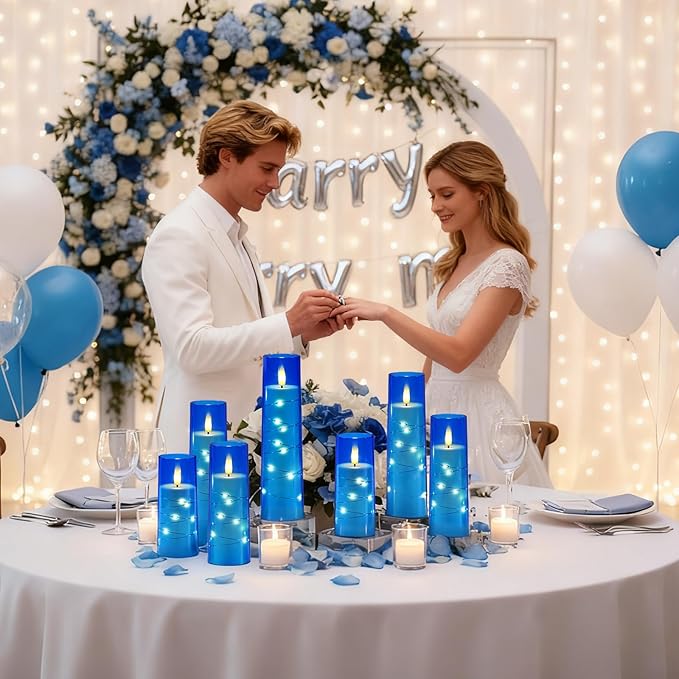 Raycare Flameless Candle with Remote Timer – 9 Flickering Acrylic Battery Operated LED Pillar Candles with Embedded Star String for Christmas, Home Decor, and as a Gift (Blue)