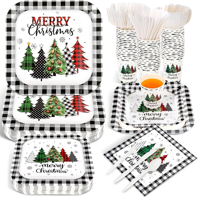 - Christmas Tree Design: this Christmas-themed banquet tableware set features a Christmas tree and buffalo plaid elements, making your banquet more interesting and attractive; The Christmas disposable tableware is suitable for holiday gatherings and can better create an Xmas atmosphere