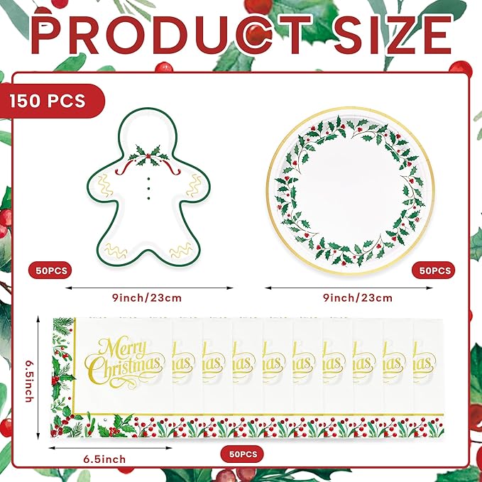 - Christmas Party Supplies: This Christmas Gingerbread party supplies includes 50pcs 9 inch gingerbread shape plates,50pcs 9 inch seasonal holly plates and 50pcs napkins(3 ply).Adding cute and holiday atmosphere to your Christmas party.