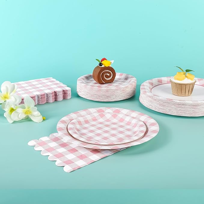 - SAFE&GOOD QUALITY : Our pink gingham paper plates sets are made of 100% food-grade,BPA-free,high gloss rigid paper. Enjoy your favorite meals and drinks without any health concerns.Throw a memorable party with our light pink decor, wow your guests. NOTE: Do not microwave pink checkered plates and napkins please.