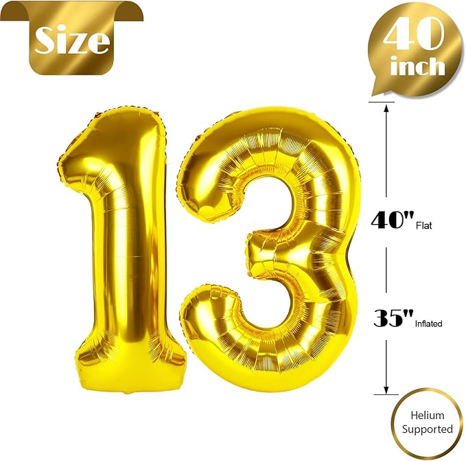 Gold Number 13 Balloon 40 Inch, 13th Birthday Party Decorations for Children, Giant 13 Foil Balloon for Party Supplies