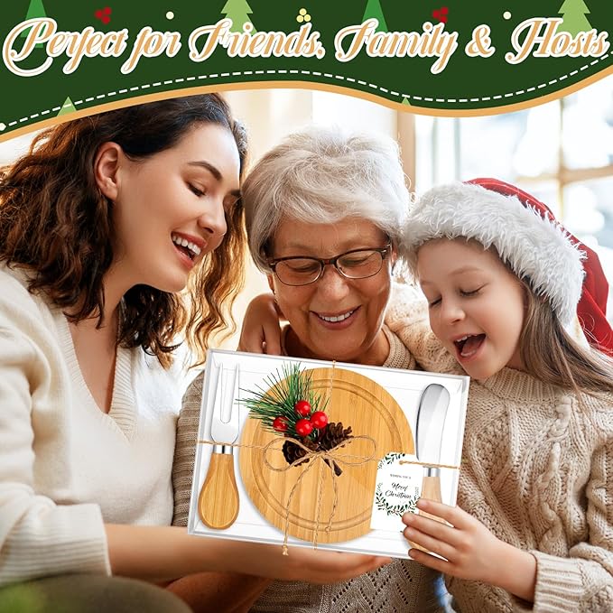 12Set Christmas Gifts Bamboo Round Cheese Board Set Cheese Knives Mini Cutting Board Set Cheese Board Gift Set Christmas Tags and Boxes Christmas Party Birthday