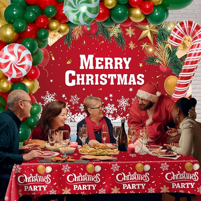 - 🎅【NON-TOXIC & SAFE】Christmas party decorations is made of safe and practical latex, latex is an environmentally friendly material, safe to use. Christmas party balloons can be filled with air or helium, balloon pump is recommended. Christmas banners are made of polyester material, lightweight, not easy to fade, soft fabric, large enough size. Disposable Christmas tablecloths are easy to use and waterproof. Both indoor and outdoor decorations can bring out the joyful atmosphere of Christmas!
