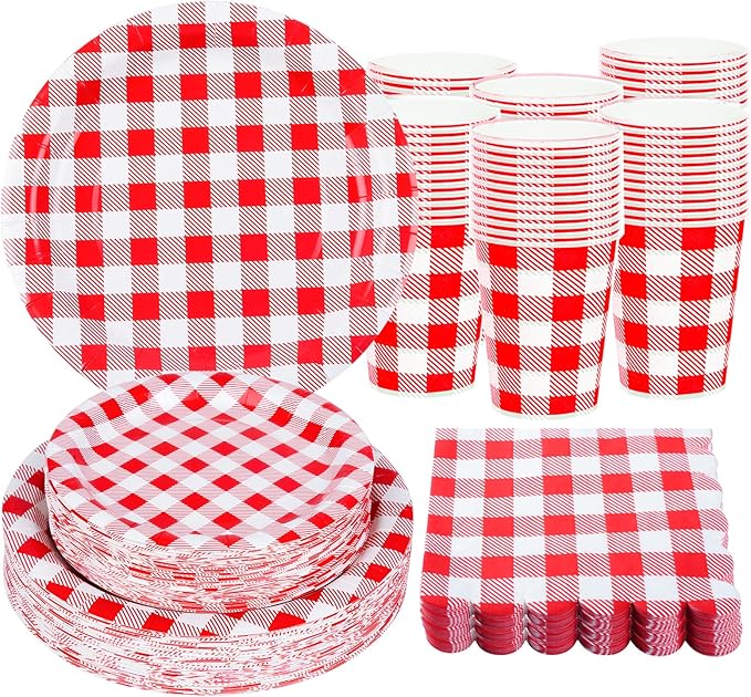 - SAFE&GOOD QUALITY : Our red and white gingham paper plates sets are made of 100% food-grade,BPA-free,high gloss rigid paper. Enjoy your favorite meals and drinks without any health concerns.Throw a memorable party with our red plaid decor, wow your guests. NOTE: Do not microwave red BBQ checkered plates and napkins please.