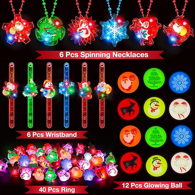 - 64PCS Christmas Light Up Toys Set - Packed with high-value Christmas light up toys, this bulk set includes 6 LED spinning necklaces, 6 glow bracelets, 40 Christmas light up rings, and 12 glow bouncy balls with festive patterns. Ideal for Christmas party favors, stocking stuffers, classroom gifts, and holiday giveaways.