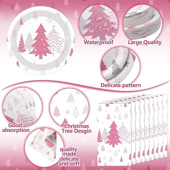 Pickmesh 400 Pcs Christmas Party Supplies Pink Silver Xmas Tree Snowflake Disposable Paper Plates Napkins Cups Cutlery for Winter Xmas Christmas Birthday Party Table Decorations Serve 50