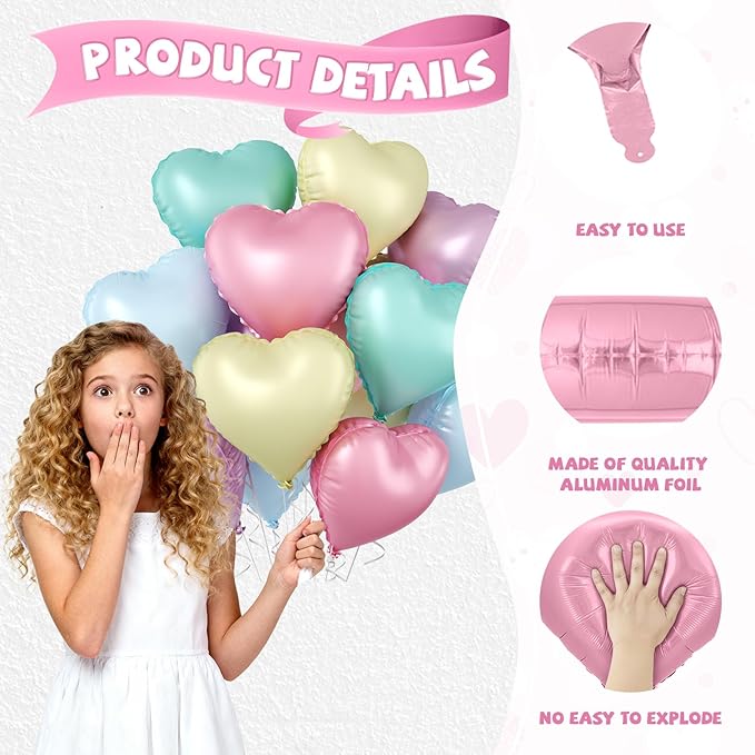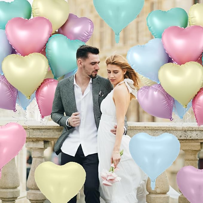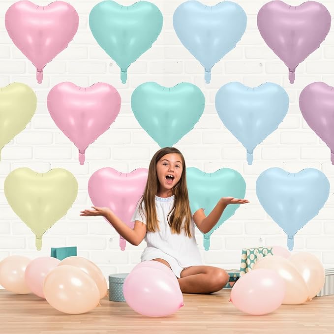 - 10 Pcs Pastel Heart Balloons: Our package includes 2 x 18 inch teal blue heart foil balloons, 2 x 18 inch purple heart foil balloons, 2 x 18 inch light yellow heart foil balloons, 2 x 18 inch pink heart foil balloons, 2 x 18 inch light blue heart foil balloons, 1 x straw for easy inflation, and 1 x white ribbon. These macaron-style heart shaped balloons feature soft candy colors, perfect for creating a cheerful and dreamy party atmosphere.