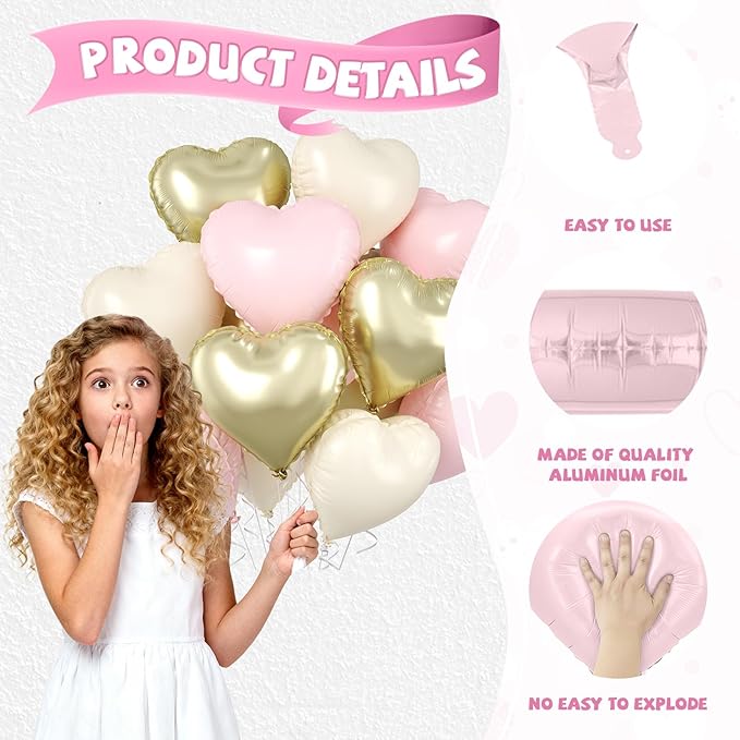 - 10 Pcs Baby Pink Gold Heart Balloons: The package contains 4 x 18 inch matte baby pink heart foil balloons, 3 x 18 inch metallic light gold heart foil balloons, 3 x 18 inch cream white heart foil balloons, 1 x straw, and 1 x white ribbon. These pastel pink and gold balloons are ideal for adding a gentle glow to party decorations.