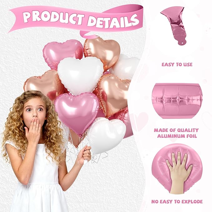 - 10 Pcs Rose Gold Heart Balloons: This package comes with 3 x 18 inch pearl rose gold heart foil balloons, 4 x 18 inch pearl light pink heart foil balloons, 3 x 18 inch pure white heart foil balloons, 1 x straw, and 1 x white ribbon. These balloons combine rose gold elegance with soft pink tones for a modern romantic touch.