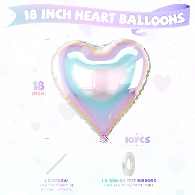 - 10 Pcs Iridescent Heart Balloons: Our package includes 10 x 18 inch transparent iridescent rainbow heart foil balloons, 1 x straw for easy inflation, and 1 x white ribbon. These clear gradient heart balloons shine with magical rainbow hues, adding a dreamy and romantic atmosphere to your party decoration.