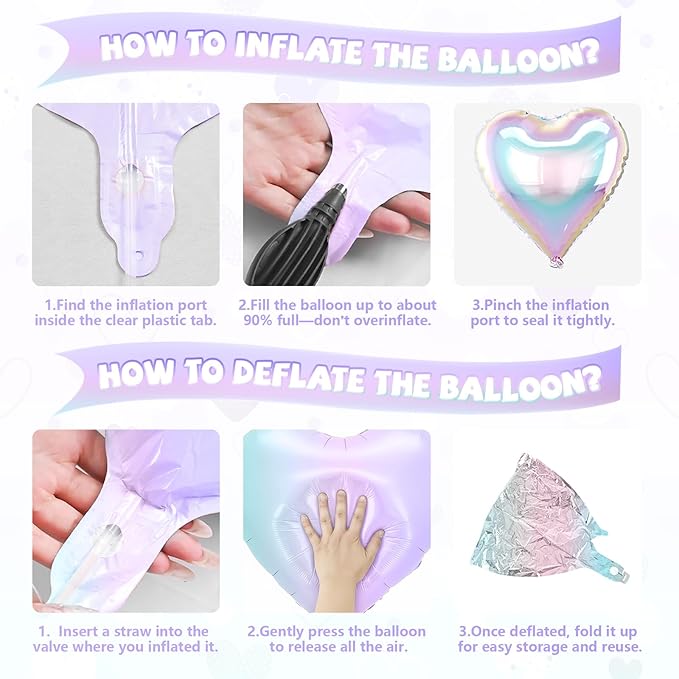 - Easy to Inflate and Use: Our heart shaped foil balloons can be filled with either air or helium. Simply use the included straw or a pump, and inflate to about 85%–90% to avoid overexpansion. Each balloon is designed with a self-sealing valve, so no knotting is required. The set also comes with a ribbon, making it quick and convenient to hang or tie the heart balloons wherever you like.