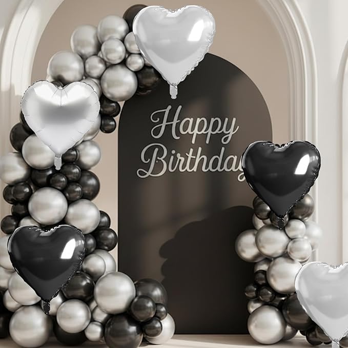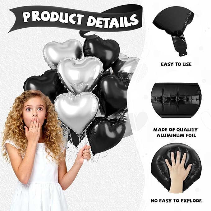 - Romantic and Versatile Decoration: Whether for a birthday, wedding, Halloween, anniversary, baby shower, or Valentine’s Day, these black silver heart balloons are a bold choice. Use them to create balloon bouquets, style photo backdrops, or add a sleek and modern look to your event space.
