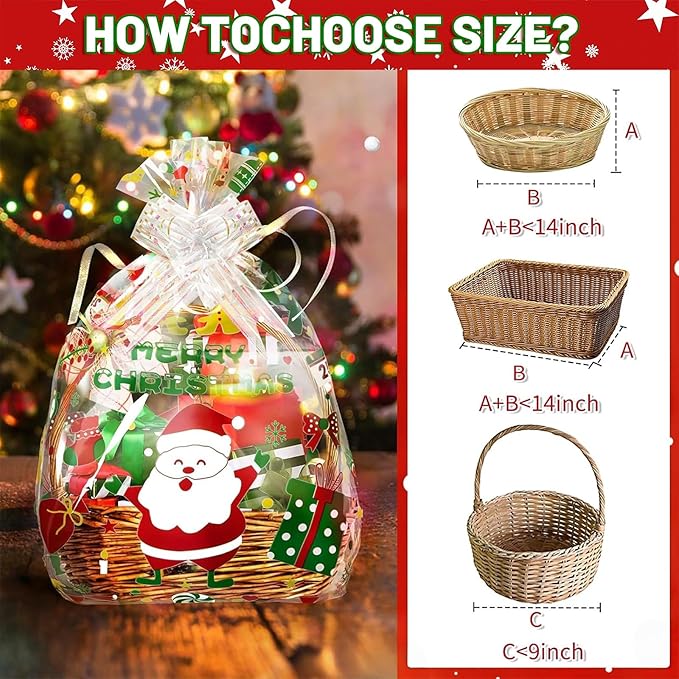 - π CHRISTMAS BAGS EXTRAVAGANZA: Get 10 premium large cellophane bags for gift baskets (16x24 inches) PLUS 10 festive pull bows! Perfect for wrapping wine bottles, holiday treats, and oddly-shaped presents. These christmas cellophane bags transform ordinary items into magical gifts with their crystal-clear transparency and durable OPP material that resists tearing.