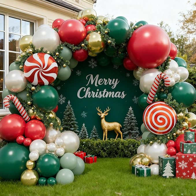 - Double Stuffed Christmas Balloon Arch Kit - OuhuangDC Christmas balloon arch kit includes double stuffed red, green, and pearl white balloons in multiple sizes (18", 12", 10", 5"), metallic gold accents, and candy cane foil balloons. These premium double-layer balloons create a rich, festive color tone for a stunning Christmas balloon arch or garland.