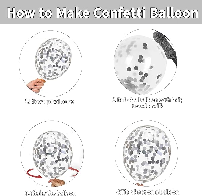 - 【How to use confetti balloons】: You just need to inflate the silver confetti balloon first, once inflated, rub the balloon against your hair or cloth and shake it, or place the balloon on a dry towel or carpet (silk or wool) and gently rub the balloon, this will help the confetti stick to the side of the balloon, making the silver confetti balloon look more beautiful.At the end of the party, you can pop the balloons to release a shower of silver confetti, adding endless fun to the party!