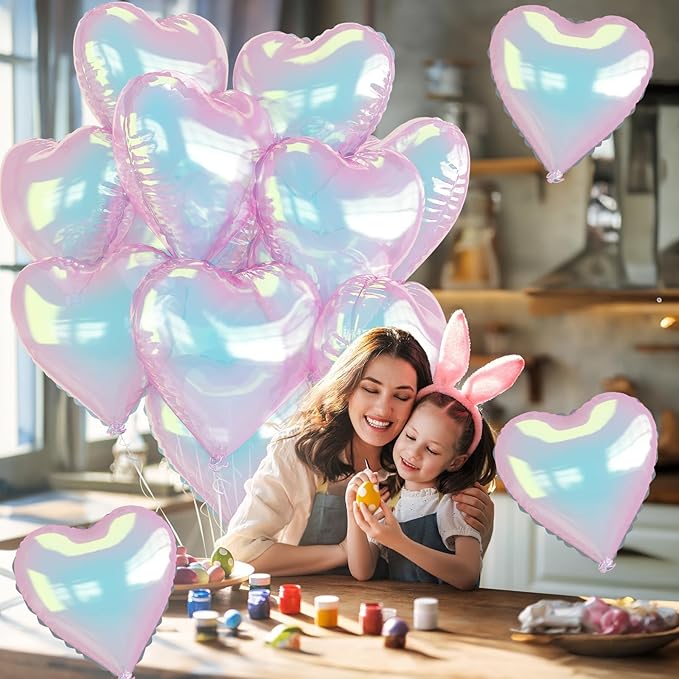- Iridescent Clear Foil Balloons: 9pcs, 18 inch gradient heart shaped foil balloons. Featuring a shimmering rainbow effect, these elegant balloons add a magical touch to any celebration