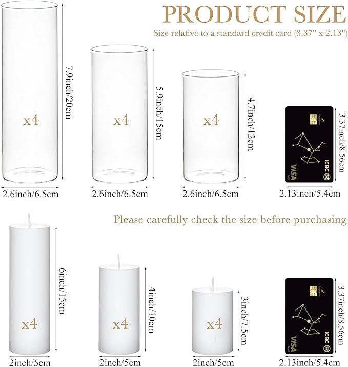 - 【Complete Ready-to-Use Set of 12】Get 12 pack vases and 12 pack candles for stunning decor in one box! This value pack includes 4 pack glass vases (2.5" diameter x 4.7" height) with 4 pillar candles (2" diameter x 3" height),4 pack glass vases (2.5" diameter x 6" height) with 4 pillar candles (2" diameter x 4" height),4 pack glass vases (2.5" diameter x 8" height) with 4 pillar candles (2" diameter x 6" height). No need to shop separately, saving you time and effort for your event planning