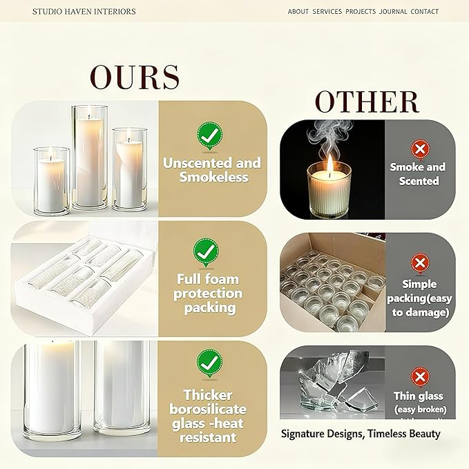 - 【Durable & Clean-Burning Materials】The candle holders are made of high-clarity, thick glass for a premium feel and reuseability. The white candles are made from low-smoke, clean-burning wax to ensure a long burn time and a pleasant atmosphere