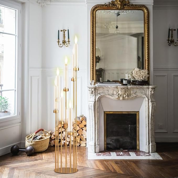 - About Product Size:Floor Candle Holders Tall Set. Material: Metal. Color: Gold Style: 7-Arm and Thick Round Base Overall Height: 48" Arms Heights: 24.6", 28.5", 32.4", 36.2", 40.2", 44", 48",Base Size: 9.36"Dia. Candle Cups Size:0.98” Dia. Note: Candles and other accessories are not included!Due to different light settings the actual color might vary a bit from the pictures.The 4 piece floor candle holders tall set can meet the decoration needs of weddings, restaurants, parties and various scenes
