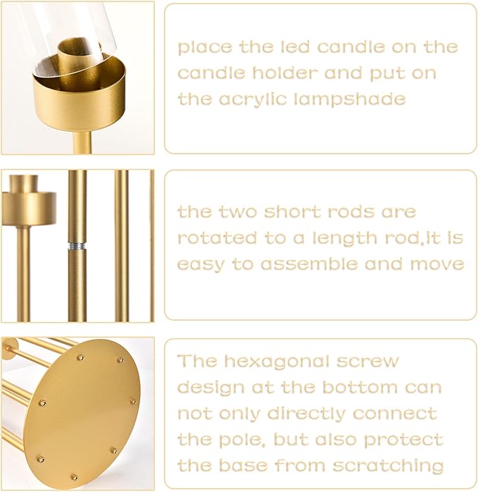 - About the Acrylic Shade and Assembly : The lamp shade is flammable, to prevent accidents it is recommended to use an electronic candle or remove it.designed for effortless assembly, our candelabra's structure is ingeniously simple yet solid; Just attach the metal rods to the base and secure the candle cups to enjoy a stable and captivating display; Please note: Be careful touching the metal edges during assembly to avoid scratching your skin