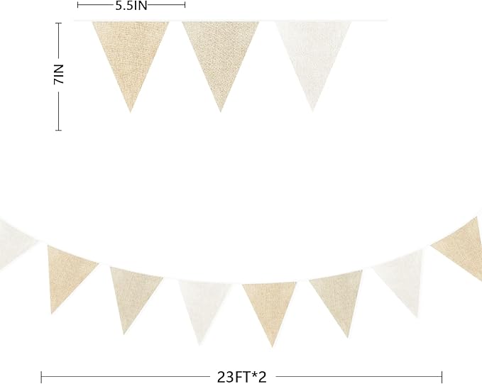 - Package Including:2 packs gradient beige burlap bunting banner garland, each string is 24pcs flags in 7M/23Feet, total is 48pcs flags in 14M/46Feet. Flag Size: 5.5in width x 7in height.